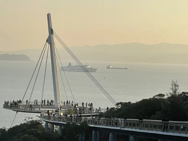 吃完出發去盼歸塔看夕陽。其實原本的行有考慮山海步道,但走路會花很多時間,梅海花台季節不對沒有甚麼花看,盼歸塔是最終那段,一路走過去太累,改搭車到盼歸塔比較實際。定位在"sky high雲尚天際酒店思明店",往上走20m就可以搭電梯上三樓,出來就可以看到塔了。