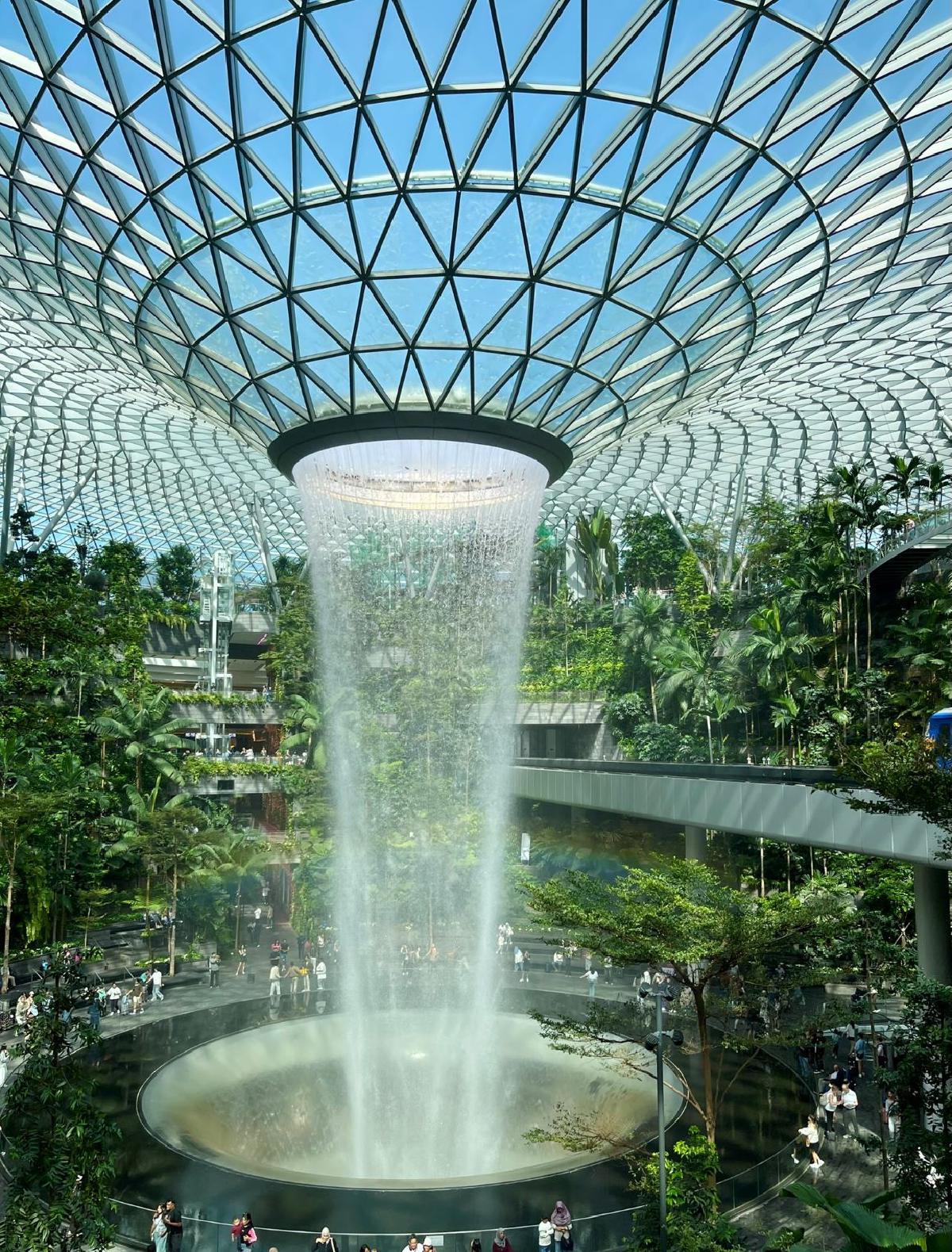 Sky train的搭乘有點曲折,我是走到1航廈,搭接駁車(也叫sky train)到2航廈,下車後改搭另一個sky train(車身彩繪)到3航廈,繞一圈再回2航廈,中途會穿越瀑布。你說很棒嗎?好像還好,就是找了半天若沒搭到會有點不甘心。如果下次再來,應該會專心逛街 XD